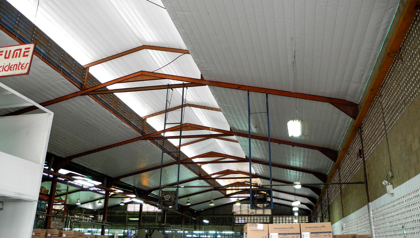 Antiblaze also offers the following benefits: Eliminates leak problems because it is waterproof, is washable, reduces lighting needs by up to 50%, reduces electrical consumption by up to 25%, is flame-retardant (does not spread fire), stops particles or segments from falling from all types of roofs (postpones the replacement of asbestos roofs), has a useful life of 15 years, and its excellent presentation provides a feeling of well-being, generating a pleasant work environment and greater staff efficiency.