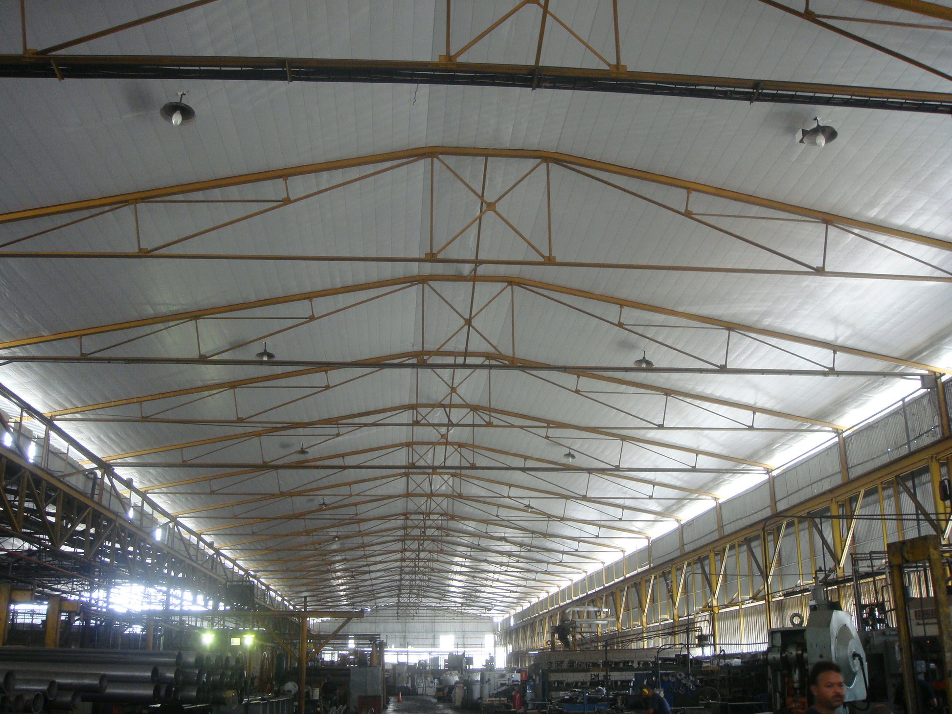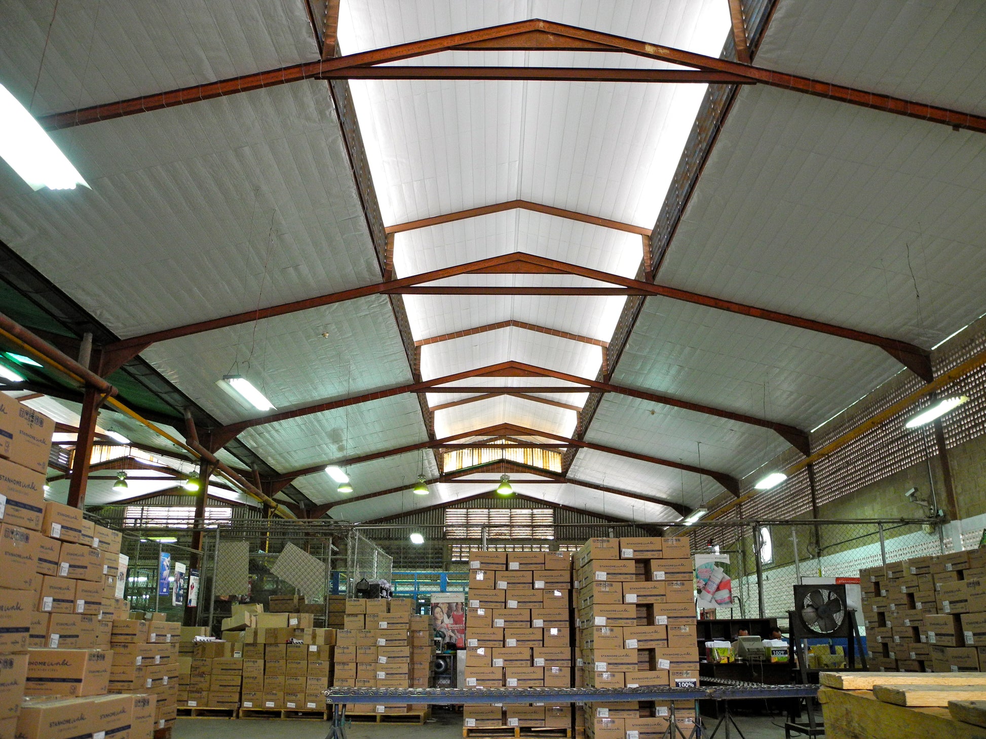 TECHO FRESCO also offers the following benefits: It eliminates leak problems because it is waterproof, it is washable, it reduces lighting needs by up to 50%, it reduces electrical consumption by up to 25%, it is flame-retardant (does not spread fire), it stops particles or segments from falling from all types of roofs (it postpones the replacement of asbestos roofs), it has a useful life of 15 years, and its excellent presentation provides a feeling of well-being, generating a pleasant work environment and greater staff efficiency.